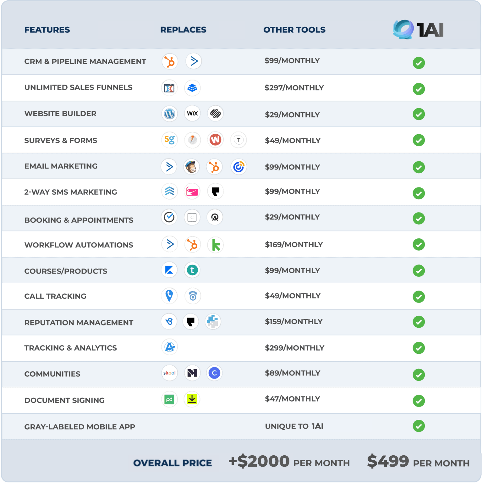 1Al isn't just an all-in-one CRM. It's your Al business operating system. Never miss a potential lead (client) with automated 24/7 hands-off solutions like:
