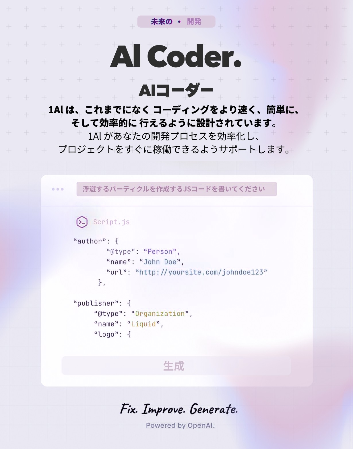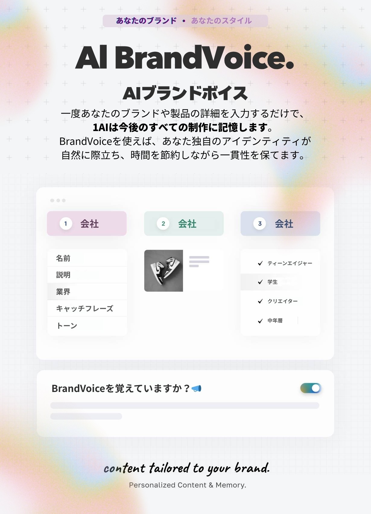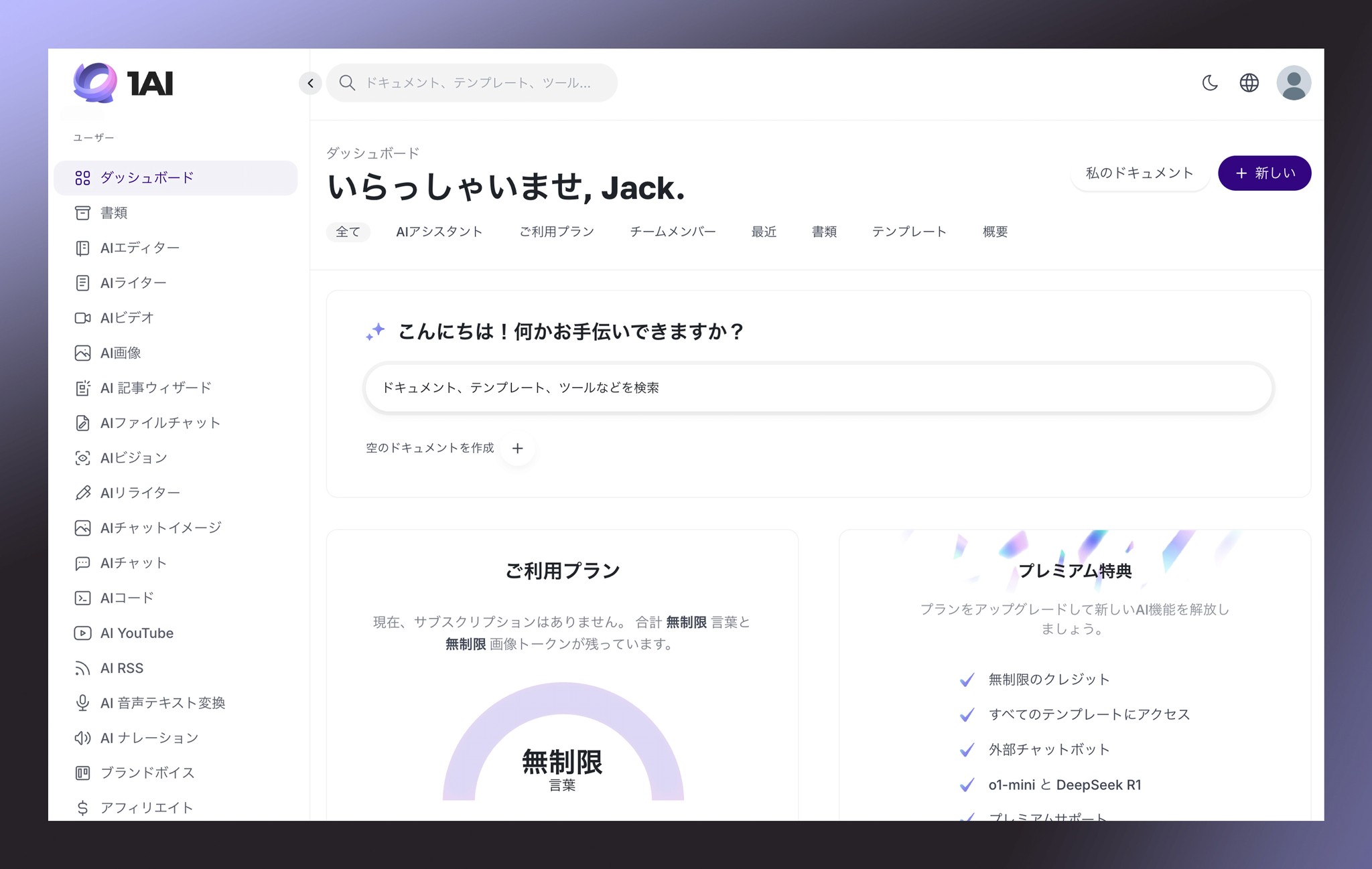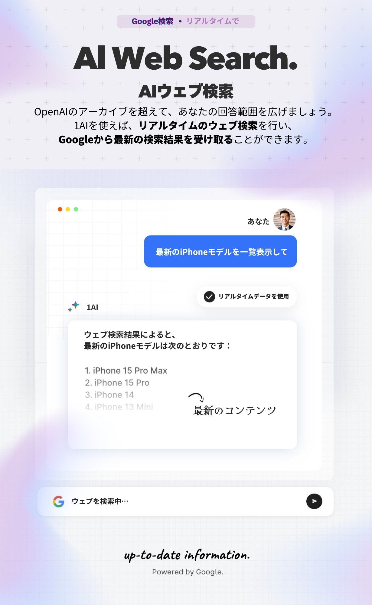コンテンツの作成も、製品の開発も、タスクの自動化も、 1AI があれば実現に必要なすべてがすぐに手に入ります。